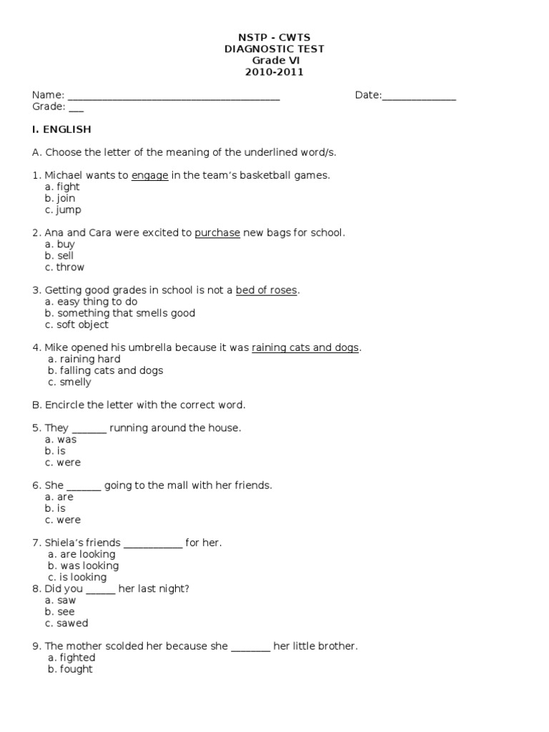 The questions are quite. A diagnostic test is a test that helps the teacher and learners identify problems that they have with the language. Diagnostic Test MATH 6 DOWNLOAD.